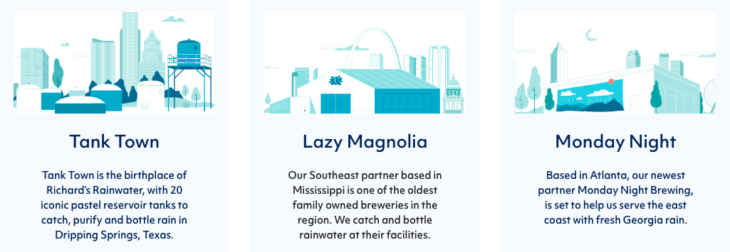 Richard’s Rainwater has been serving cloud to bottle since 1998. It started with a quest to get cleaner, better-tasting water for a ranch near Austin Texas in 1994. And has grown into a movement to provide clean, great-tasting water for everyone, everywhere. Richard’s Rainwater harvests rain before it touches the ground. That means using significantly less energy and not depleting the local water supply. Richard’s Rainwater now produces more than 2 million bottles and cans and collects over 30,000 gallons every time it rains one inch at one of the sites — at Tank Town in Dripping Springs Texas, Lazy Magnolia Brewery in Mississippi, and Monday Night Brewery in Atlanta.