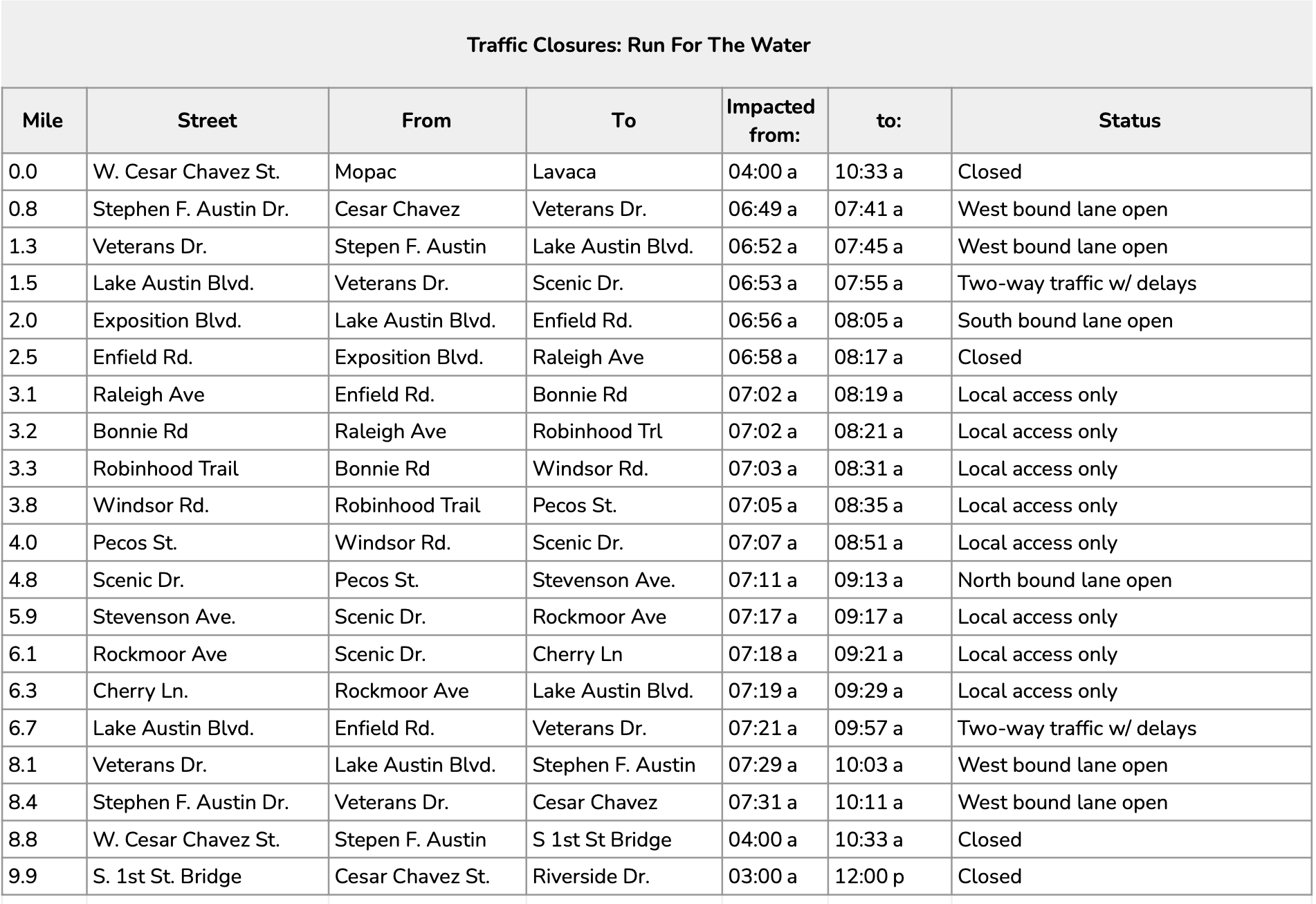 Traffic Closures: Run For The Water, Sunday, November 9, 2025